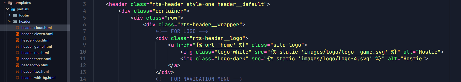 To customize you site header open the Hostie in your editor and go to the location by following screenshot which are given bellow. You just need to change the header style. such as: header-one To header-two for Style Two. Hostie Template has 7 different header styles